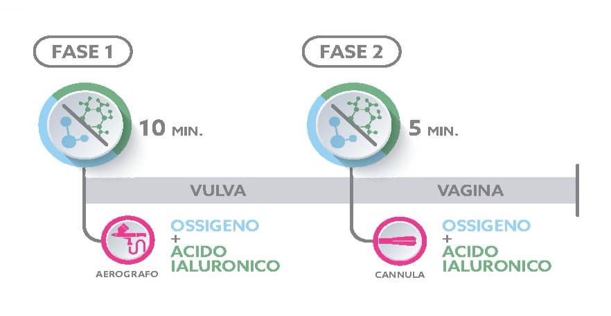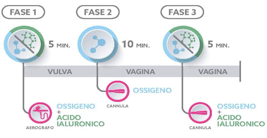 Per i primi 10 minuti si eroga ossigeno sulla vulva tramite nebulizzazione (da effettuare a 2 mm dalla vulva) con acido ialuronico a basso peso molecolare (3ml). Per i successivi 5 minuti si eroga ossigeno combinato con acido ialuronico in vagina (12ml).