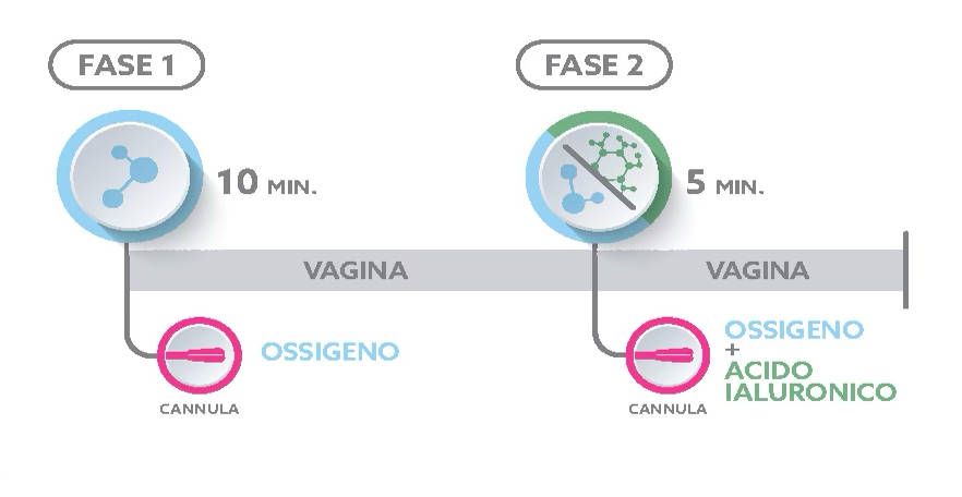 Per i primi 5 minuti si eroga ossigeno sulla vulva tramite nebulizzazione (da effettuare a 2 mm dalla vulva) con acido ialuronico a basso peso molecolare (3ml). Per i successivi 10 minuti si eroga esclusivamente ossigeno in vagina e per gli ultimi 5 ossigeno combinato con acido ialuronico sempre in vagina (12ml).